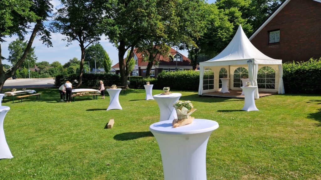 Neben unseren hochwertigen Zelten kümmern wir uns auch um die Innenausstattung. Wir bieten Ihnen alles, was Sie für eine gelungene Feier benötigen: von Holzfußböden im Zelt über Bierzeltgarnituren mit Tischdecken und Hussen bis hin zu Stehtischen, Theken, Kühlschränken und Heizungen. Auch Geschirr und Partydekoration gehören zu unserem umfangreichen Angebot. – wir machen Ihre Feier perfekt!